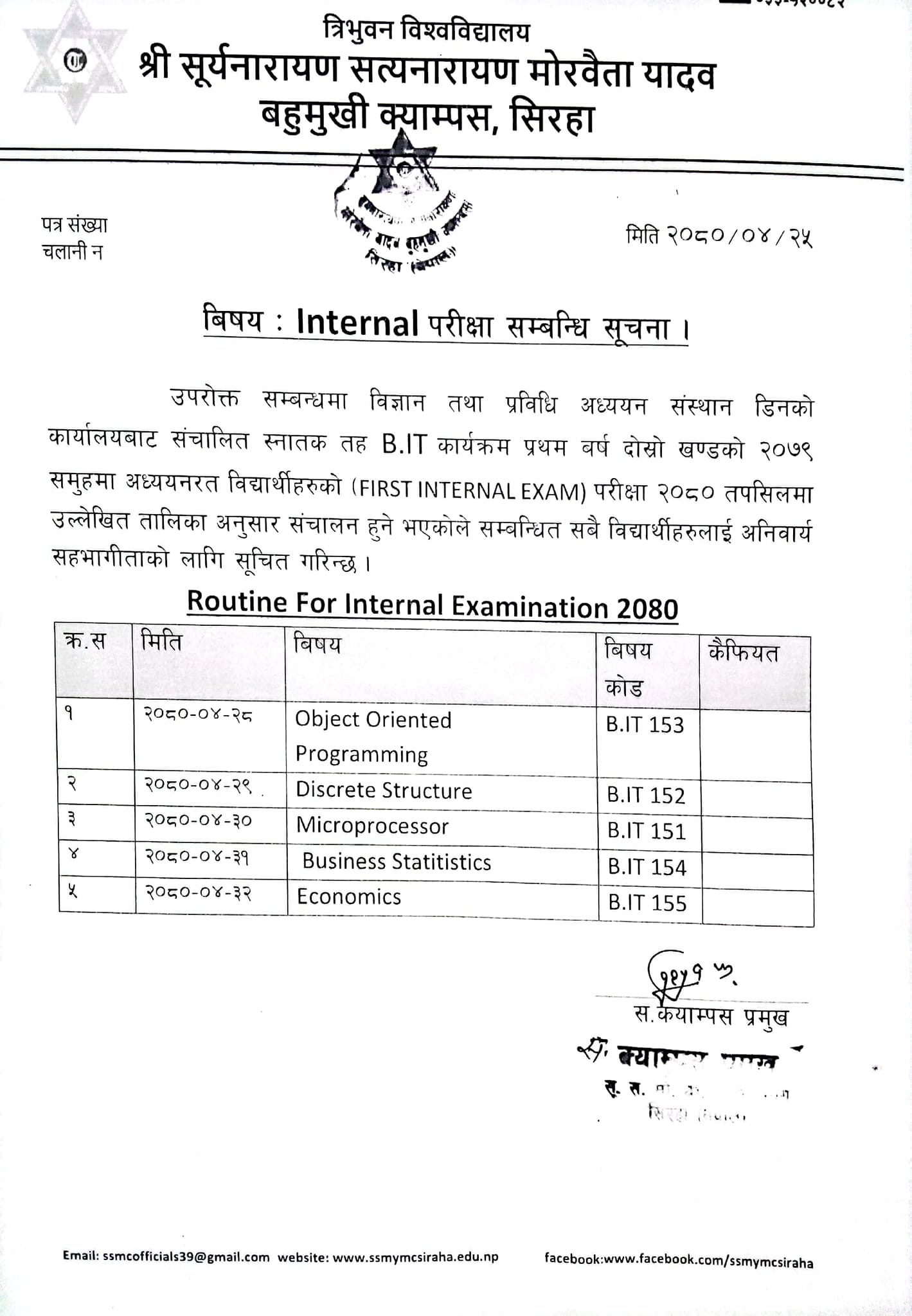 B.IT को INTERNAL परीक्षा सम्बन्धि सूचना