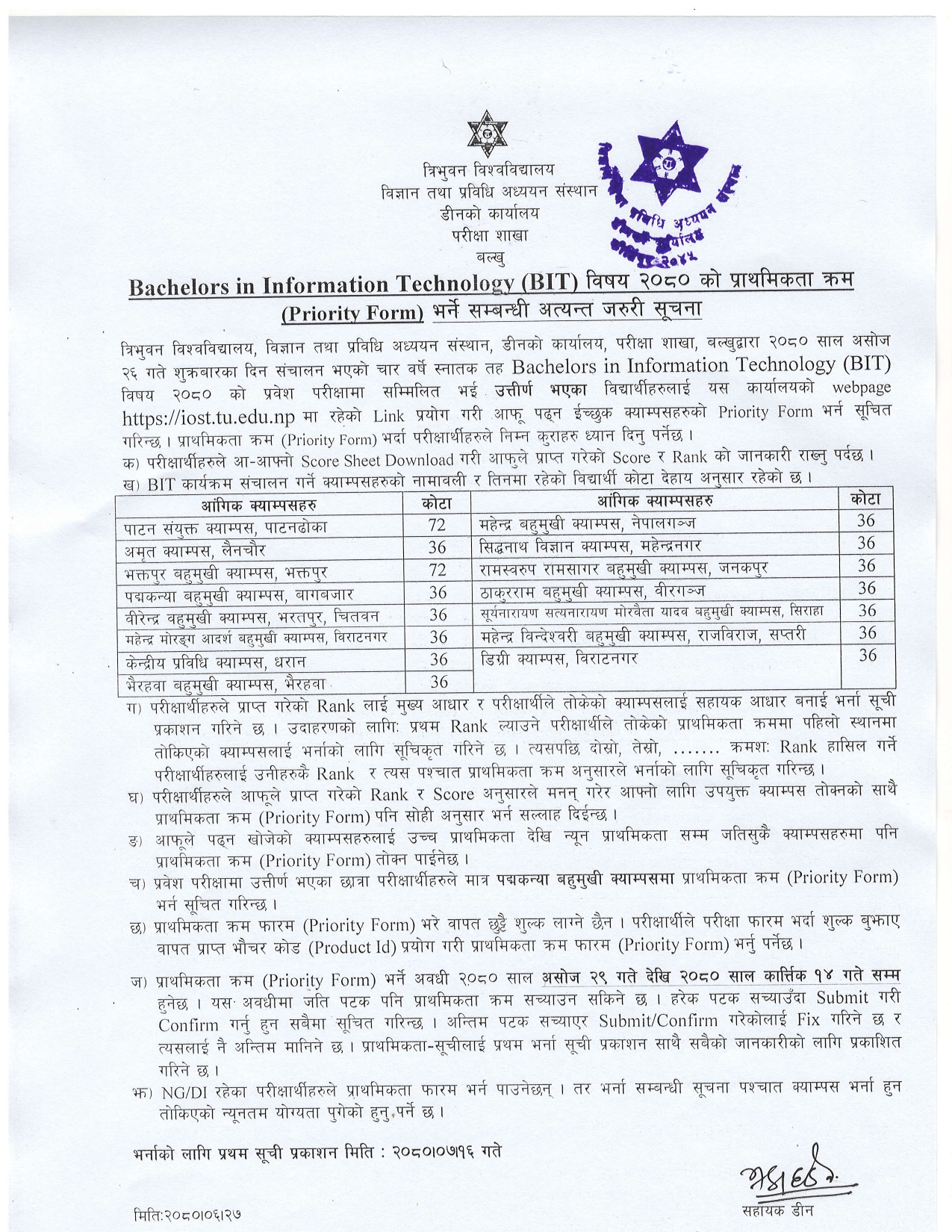 Bachelor in Information Technology (BIT) विषय २०८० काे प्राथमिकता क्रम (Priority Form) भर्ने सम्बन्धी सूचना Files