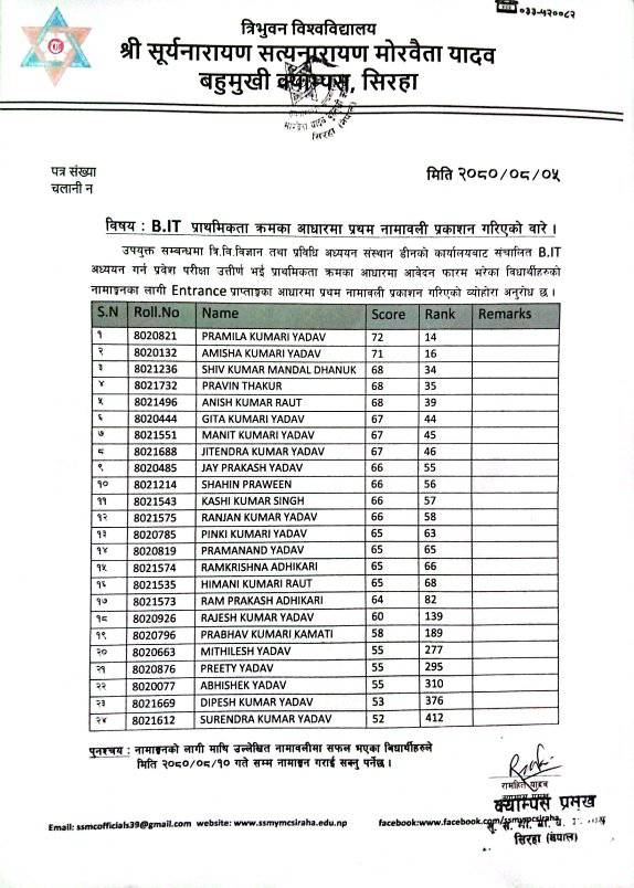 First Admission list of BIT 2080. (OPEN) ADMISSION DATE :२०८०/०८/०६ गते देखि २०८०/०८/१० गते सम्म